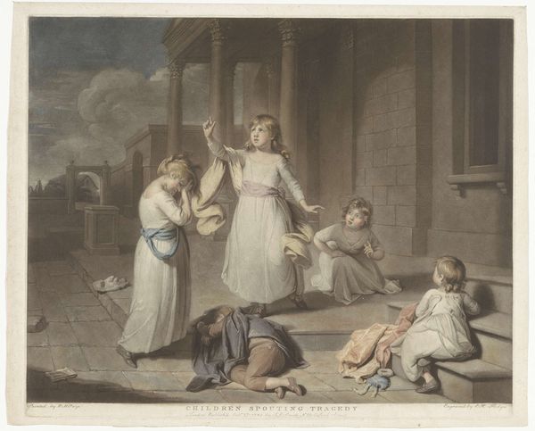 Editor: So this is “Children Reading the Inscription on their Mother's Gravestone” made in 1785 by William Ward. It’s a somber scene, five children clustered around a grave, rendered in these soft watercolors. There's a sense of stillness and loss. How do you interpret the imagery at play here? Curator: This image is striking in its use of visual symbols to explore themes of loss and memory. The gravestone itself, obviously, represents not just death, but the permanence of memory. What do you make of the children's postures and placement around it? Editor: Some are touching the stone, one seems lost in thought... They’re all reacting differently. Is that significant? Curator: Precisely! Think about it - each child embodies a different facet of grief. One traces the inscription – perhaps clinging to words, to stories. Another sits apart, isolated with their grief and holding what looks like a toy bird... This highlights the individualized nature of mourning. The setting—a churchyard, a place of both mourning and possible solace, of transition between worlds—adds layers too, don’t you think? Editor: That’s true; the church and graveyard create such a strong visual and emotional context, emphasizing mortality, but also continuity in a way... Does that continuity have something to do with cultural memory, of how mourning rituals remain through generations? Curator: Excellent point. Ward, and Romanticism in general, were fascinated with emotional impact on memory; with how symbols transcend individual experience and enter a shared cultural consciousness. Think of graveyards like graveyards - places both terribly individual, but terribly collective at the same time. Editor: It’s much more than just a scene of grieving children. It's about how we process and remember loss collectively. Thanks! Curator: My pleasure. The painting provides an aperture onto not just a scene, but something timeless about what is carried by cultural memory and visual imagery across generations.
