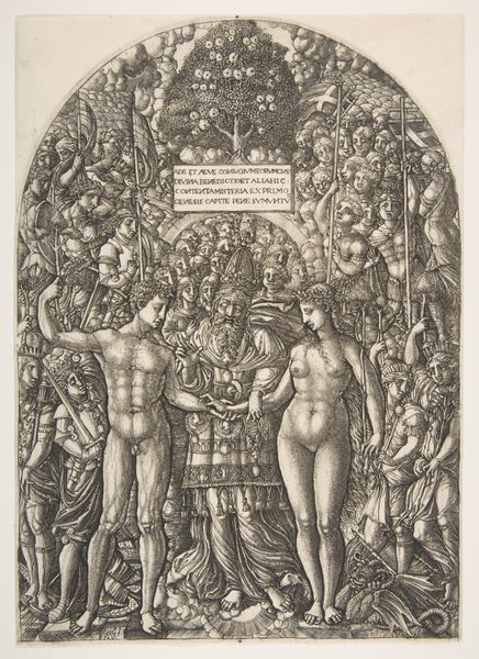 Curator: This is the frontispiece to the "Historia Naturalis Brasiliae," printed in 1648. It’s an engraving. We attribute it to Theodor Matham, although that remains debated by some. Editor: Wow. Overwhelming doesn’t begin to describe it. Dense, intense, like a jungle crammed onto a single sheet. What's even happening here? Curator: It represents a vision of Brazil filtered through a European lens, specifically Dutch colonial interests. You see indigenous Brazilians alongside a reclining figure symbolizing a river god, fauna, flora and other colonialists behind a screen of trees, a sort of idealized landscape representing newfound resources. Editor: Idealized maybe for the colonizers. For me, it feels… performative. Like it's staging Brazil for consumption, literally framing it for a European audience, monkeys, turtle and all. Look at those figures! They look like actors striking a pose, not living, breathing people. Curator: Well, Matham was working from descriptions and perhaps sketches provided by others; first-hand experience wasn’t the basis for his art. His skill as an engraver lies in synthesizing these elements into a coherent and visually engaging image. Editor: I guess, but even the texture is interesting. The close hatching of lines, creates a kind of shimmering effect, almost like heat rising. Maybe that adds to that feeling of unreality, the heat of expectation and greed. Curator: Or simply a highly detailed reproduction process, suited to printing multiple copies, intended for wide distribution as part of a scientific treatise. These kinds of images are a crucial aspect of the consumption and propagation of new ideas, as the West invades the East. It’s what these colonizers leave as the sole images of Brazilians. Editor: Good point. So it's both an attempt to capture and also a declaration of ownership, packaged and distributed. Fascinating and deeply unsettling, a window into both scientific curiosity and the colonial mindset. Curator: Precisely. It’s a piece that reminds us of the inherent biases and complex motivations embedded within seemingly objective representations of the world.