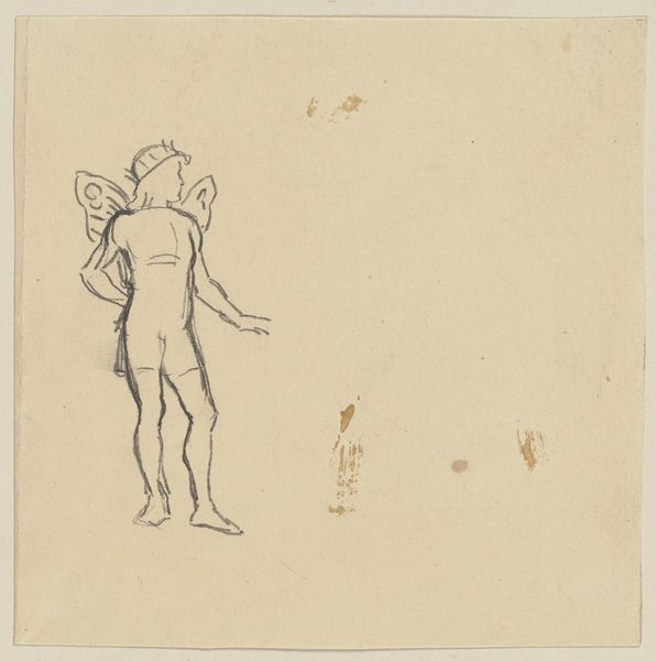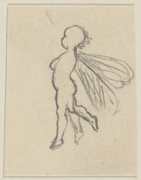 Editor: This is Paul Konewka's "Puck mit Fl\u00fcgeln, schwebend, nach rechts", or "Puck with Wings, Hovering, to the Right," created around 1867 or 1868 using pencil as the medium. It's a quick sketch, very light and ethereal, which gives it an ephemeral quality. What can you tell me about this depiction of Puck, and how does it relate to the art world at the time? Curator: The choice to depict Puck at this time reflects a broader interest in folklore and mythology, especially within the Romantic movement. But notice how this isn't just any fairy; it's *Puck*. What might the artist be implying by selecting this specific character from Shakespeare's "A Midsummer Night's Dream?" What socio-political forces might be in play when an artist turns to such subjects? Editor: I suppose that, by embracing fantasy, Konewka is pushing back against industrialization. Fairy painting wasn’t particularly ‘serious,’ but maybe that was the point? To question academic traditions of what art should depict? Curator: Precisely! The rise of industrialism certainly prompted some to yearn for a simpler, more enchanting past. This drawing enters into the discourse around escapism through art, especially in the mid-19th century, suggesting art as a retreat. However, the positioning of Konewka’s Puck also invites considering art's potential to subvert the then-burgeoning academic definition of "high" art. Where do you see evidence of that here? Editor: Well, it's a drawing, a study, and it isn’t necessarily finished or polished, almost like a fleeting thought captured on paper. This very roughness becomes the focus, making me wonder if that aesthetic was pushing boundaries and challenging the rigid definitions that defined art. Curator: Exactly! That’s how imagery engages within politics, and what makes a piece such as this so fascinating, not only historically, but even to our present moment. What do you take away from considering those elements? Editor: I hadn't thought about it as challenging artistic norms, but situating the piece within broader social changes really opens up my understanding of it. It’s much more than a drawing of a fairy! Curator: And hopefully reveals that seemingly innocuous subjects like fairies play into wider debates. Considering those debates enriches the artistic narrative and enhances art appreciation today.