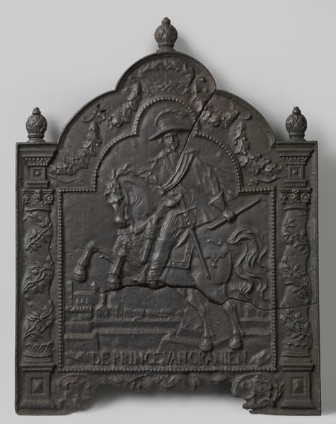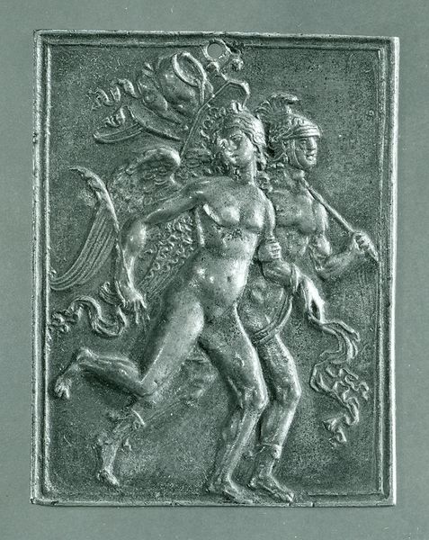 Curator: This artwork, created in the 16th century, is titled "Karl V til hest" and depicts Charles V on horseback. It’s rendered in silver relief and resides here at the SMK, Statens Museum for Kunst. Editor: My first thought is: austere power. The starkness of the silver, the rigid posture of the rider… it projects a sense of unyielding authority, crafted in metal. I can’t help but wonder about the social implications and process required to achieve such striking power. Curator: Absolutely. Consider the historical backdrop: Charles V was a towering figure, ruling over a vast, diverse empire. This piece speaks directly to his carefully cultivated image as a strong, divinely appointed leader, and serves to situate the subject within his own history. What are we meant to think of him and of power in the 16th century? Editor: And think of the silversmith's labour! The sheer effort to manipulate this metal into such intricate detail is impressive. The landscapes, the horse's harness… what workshops might have been involved? Whose hands shaped this symbol of power, and what did they gain from it? It encourages thinking about the hierarchy of labour involved in creating this piece. Curator: That’s an important layer. The landscape behind Charles V isn’t merely decorative, it's carefully constructed. I interpret the serene hills and suggestion of his dominion over those landscapes, creating a visual argument for his inherent right to rule and how these are often fantasies or social constructions that reinforce inequality. Editor: And the choice of silver itself— beyond its aesthetic appeal, it represents wealth, access, and, control of resources. Did it reflect the emperor's access to precious metals, and subsequently act to enhance his image of almost unachievable prestige? Curator: Precisely. Furthermore, pieces like this reinforce how power is constructed. In this sense it's both artistic representation but also an idealogy. This work presents Charles as a paragon of Christian European authority – a legacy viewed with increasing skepticism through our current lens of post-colonial perspectives. Editor: Looking at this from a more grounded point of view, the silver is more than luxury, it is something mined from the earth. Thinking through it in this way it becomes material through exploitation of people and environments. The work becomes both image of power and artifact of power. Curator: I agree. By situating this portrait within a history of both the powerful and the laboring class we confront complicated issues. Looking closely brings both Charles and his era into complex focus. Editor: It really puts into perspective how art and material are so closely intertwined with the workings of the world at large. Thanks for helping to guide our understanding!