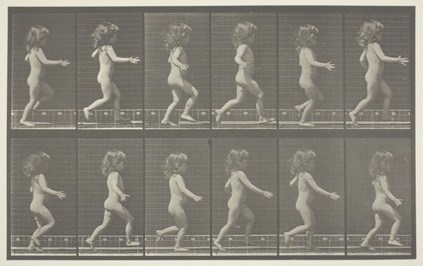 Curator: This gelatin-silver print from 1887 is entitled "Plate Number 71. Running," and it’s by Eadweard Muybridge. What is your first reaction to it? Editor: The repetition is fascinating, almost hypnotic. The way the figure is broken down into these sequential moments feels so modern, yet it's clearly from another era. I’m curious, what purpose did these types of motion studies serve? Curator: These photographs capture human locomotion to examine previously unseen aspects of movement, something the human eye could not process in real-time. But look closer: these weren't just scientific studies; the images evoke earlier artistic representations of the body, like classical statuary, don’t they? Editor: Absolutely! Especially with that loose, flowing gown, there is a very romantic, almost allegorical quality in contrast with what seems to be the primary scientific intent. Curator: Exactly. I find it interesting that this choice, dressing the runner in that loose fabric, actually makes reading the nuances of the motion easier. It’s like an intentional reference to classical drapery, allowing for emphasis of line, volume and gesture. But consider the period; for women, running was still restricted, either for exercise, or from violence. This motion—the agency represented here—is noteworthy in a social context, wouldn't you agree? Editor: I do. Seeing the body in motion as freedom is very powerful. Here’s this woman breaking out of the rigid constraints of her time. Yet, let’s not forget the other figures Muybridge studied, or how this series supported very different scientific viewpoints too. There is something uncomfortable with the scientific gaze in the images—seeing her almost specimen-like is unnerving, no matter how elegant she appears to be. Curator: That friction is critical for us to consider as viewers. It speaks to the complexity of human perception and intention, doesn't it? Even in something seemingly straightforward, we encounter layers of cultural significance. Editor: I agree, thinking through how even in motion there is an element of artifice in what may seem simple. Curator: These layered perspectives help deepen the resonance and give "Running" its lasting appeal. Editor: Indeed, it provokes thought, which is exactly what powerful images do.