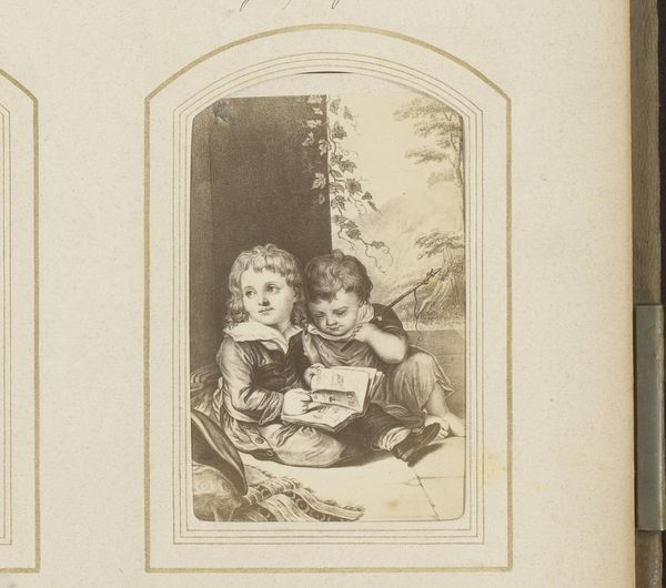 Curator: Looking at Kate Greenaway's "Valentine" from 1880, currently held at the Metropolitan Museum of Art in New York, I’m immediately struck by the feeling of innocence it evokes. The light color palette, the details—watercolor and print combined create a whimsical image of childhood. Editor: The texture of the print gives it a sense of materiality; you can almost feel the paper’s grain. The ducks especially highlight the materials used, creating depth and motion through the watercolour effects, blurring the lines between traditional printing and fine art practices. It seems such care was placed on each detail. Curator: Absolutely, Greenaway often portrayed children, imbuing her works with romanticism. This piece, ostensibly created as a greeting, feels like it engages the complicated social mores that dictated acceptable forms of love. The valentine imagery allows us to consider the ways in which love is often bound by structures. How do these young characters navigate through tradition? Editor: Yes, and if we delve into production techniques, consider what it meant to create affordable art prints at this scale. Were these individual pieces meant to be framed? Mass produced? What did its making mean to a late-nineteenth-century viewer—the commodification of art through the labor and tools used to make these greeting cards accessible to broader society? Curator: Considering the context, the card format hints at broader Victorian themes of affection, while the artist's work invites critique on idealization, the complex historical views on the role of children in the family and the value and labour placed on expressions of affection. How many women artists gained renown via more commercial routes? Editor: Looking closely at how Greenaway handled color, especially in rendering fabrics and her depiction of water, illuminates a delicate, iterative artistic approach, but at its heart the artwork, due to its materiality, democratizes artistic consumption. It is so striking how the artist manipulated the watercolors in this reproductive printing, even. Curator: Indeed. Examining it closely makes one reflect on what and whom we choose to cherish. It’s a powerful way of understanding that seemingly simple sentimental imagery are full of layered political narratives. Editor: Yes, understanding art practices such as those demonstrated by Greenaway allow us to comprehend not only individual works but also entire creative economic networks. I agree that such "simplistic imagery" provide critical historical insights into artistic networks and their ability to alter how we access culture today.