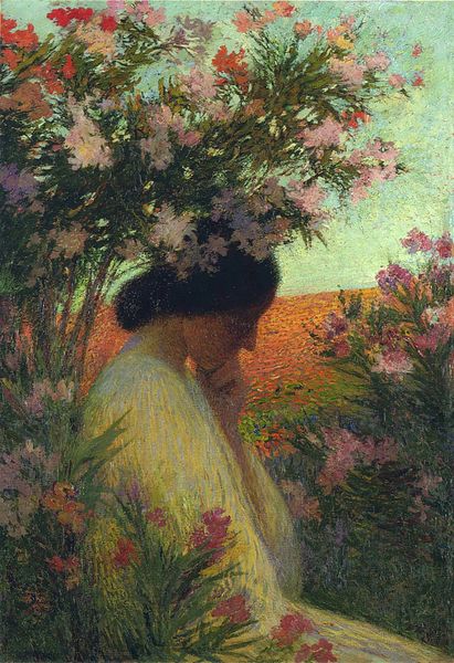 Odilon Redon made this painting, “Predestined Child,” with oil on canvas, but when, exactly? Who knows! Look closely, and you’ll see it’s like a memory, all soft edges and glowing color. Redon’s paintings often feel like he’s chasing a feeling more than depicting a scene. The paint is applied in layers, kind of thin but built up, especially around the figure and flowers. It’s not about hiding the process, but about building something up, stroke by stroke. Notice the way the light seems to come from everywhere and nowhere. And that arm reaching out—is she touching something or dreaming it? Redon reminds me of other symbolist painters, maybe someone like Moreau. But he has a sensitivity to color and mark-making that feels very modern, almost like he's in conversation with painters who are yet to come. What does it mean to be “predestined”? What does it mean to paint a picture? Is it all just a dream?