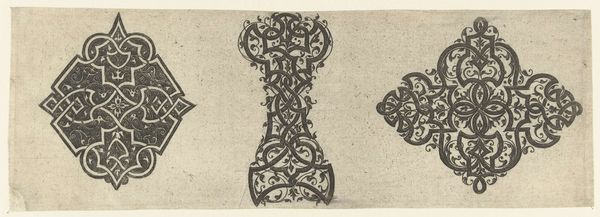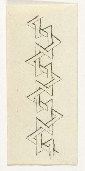Editor: This graphic drawing, titled "Band met een driehoekmotief," dating from 1876 to 1924, is held at the Rijksmuseum and created by Gerrit Willem Dijsselhof. It looks like a fragment, maybe a study for a larger work. What catches my eye is the repetitive use of geometric shapes, particularly those triangles. What do you see in this piece? Curator: The interest here lies precisely in that repetition and its interplay with the line. Note how the stark contrast between the dark, filled triangles and the lighter background generates a rhythm. Observe, too, the carefully placed dots. Do they not serve as visual anchors, balancing the dynamism of the diagonal lines forming the larger diamond shapes? Editor: Yes, I see what you mean. They punctuate the rhythm. The dots prevent the overall composition from becoming too chaotic. I'm curious; does the irregular execution, especially the slightly wavering lines, contribute to the overall effect? Curator: Absolutely. It injects an element of the handmade, disrupting the potential for sterile perfection. The imperfections soften what could otherwise be an overly rigid geometric structure. It’s this tension between precision and imperfection that grants the work its unique character. Notice, moreover, the strategic placement of the thicker horizontal lines, top and bottom. What role do they seem to perform? Editor: They frame it all, containing the energy within the central band. So, the whole is greater than the sum of its parts. I see so many geometric shapes here! Curator: Precisely. Dijsselhof has successfully orchestrated these discrete elements into a unified and visually compelling whole. It showcases the power of formalism in revealing beauty. Editor: I’ve learned a lot by closely examining this pattern – how the interplay of lines, shapes and even imperfections contributes to its impact! Curator: And I’ve found renewed appreciation for the fundamental role of geometric precision when it’s so easily taken for granted. Thank you!