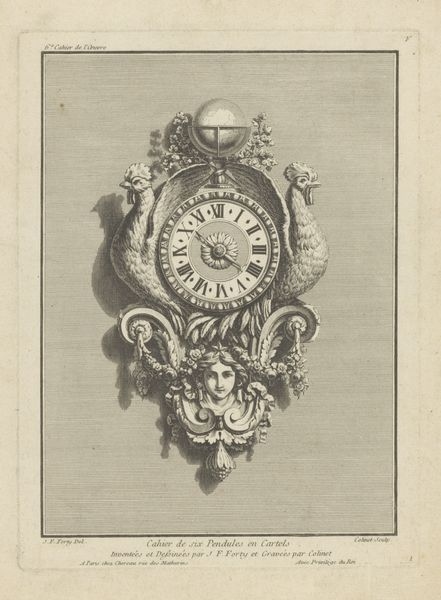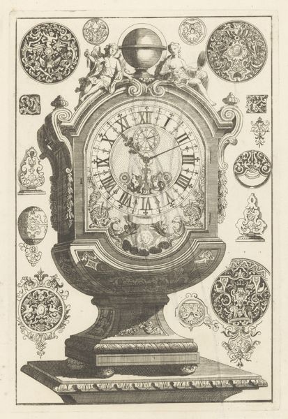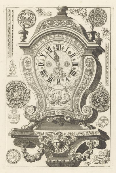 Curator: Here we have a rather delightful engraving from the Rijksmuseum collection called "Klok met putti," dating from 1719 to 1775, created by an anonymous artist. Editor: My initial reaction is pure whimsy. It’s delicate and slightly outrageous all at once. So detailed! And those chubby cherubs—putti—are adorable. But what's with the time-obsessed putti? Are they watching time slip away with the audience? Curator: Those putti certainly encapsulate the Baroque obsession with ornament and movement. Time was viewed through the lens of grand allegories and symbolic flourishes. The clock itself, adorned with these figures, becomes more than a time-telling device; it's a statement about mortality and the passage of life, don't you think? Editor: Absolutely. But look closer – it’s almost satirical! The putti seem less mournful and more...mischievous. As if they are joyfully pushing time, laughing as the sands fall. Curator: That reading definitely disrupts any sentimental assumptions about clocks and time. It’s worth considering how engraving as a medium contributed to this dissemination of ornament. Prints made these elaborate designs accessible and reproducible. It gave the engraver access to wide scale distributions of artworks they had never personally experienced in some cases. Editor: Which means everyone wanted elaborate, swirling clocks festooned with baby angels, even if they couldn't afford them in reality! You've touched upon distribution - this could be the "influencer" culture of its day? Curator: It is a clever connection to modern influence - mass replication can democratize stylistic preference. Consider the subtle ways Baroque aesthetic elements recur throughout different time periods to follow how we consume artwork over centuries. Editor: Looking at it this way opens the image up to a more fun and nuanced dialogue about temporality – how perceptions about history affect material cultural exchange, or really any moment in life. Makes you think! Curator: Precisely! The image functions on different levels - it represents a historical artifact as an aesthetic item as much as it can embody cultural aspirations, anxiety, memory, influence and transformation across time. Editor: You are absolutely right, It’s amazing how much emerges from these unassuming decorative traces. Now I must go—apparently, I have a baroque clock to catch!