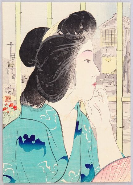 Editor: This woodblock print, "Rouge," created in 1933 by Torii Kotondo, is striking! It portrays a woman applying makeup. The contrast between the detailed hair and the soft background is captivating. What stands out to you? Curator: It's the materiality of "Rouge" that I find compelling. The ukiyo-e tradition, here revived in the *shin-hanga* movement, necessitates a deep consideration of process. Think of the labor: the carving of the woodblocks, the layering of inks, the physical act of printing. Each stage influences the final image. The "rouge," for instance, is more than just a cosmetic; it's pigment, ground and mixed, then transferred to the wood, then to paper, and finally to the skin of the subject. Editor: That's fascinating. I hadn’t considered the layers of labor involved in creating a seemingly simple image. Does the use of the woodcut medium influence our interpretation of the subject? Curator: Absolutely. This isn't painting, where the artist's hand is directly visible in the brushstrokes. Woodcut demands a different kind of authorship. It's collaborative, involving the carver, printer, publisher, and of course, the artist. "Rouge" becomes an artifact of that social and material process. How might the consumption of such prints differ from, say, oil paintings in the West at the time? Consider where and how these would be displayed, used, and circulated. Editor: I see! This print isn't just a pretty picture; it's a product of specific material conditions and labor practices, revealing social context. Curator: Precisely. Looking at it through a material lens encourages us to question the art's origins and circulation. Editor: Thanks. This helps me consider art production beyond the artist and to appreciate other contributions.