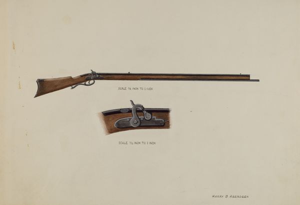 Curator: Rose Campbell-Gerke created this piece, entitled "Revolver," sometime between 1935 and 1942, employing watercolor, charcoal, and pencil. The artwork presents a rather straightforward depiction, wouldn’t you say? Editor: Stark! Almost a clinical detachment to it. The object dominates the space, yet there’s also this old-world feel coming through—the wood grain and faded gold. It speaks to ideas of power and perhaps obsolescence at the same time. Curator: Indeed, the revolver carries immense symbolic weight tied to concepts of law, violence, and national identity. The 1930s and 40s saw a shift in representations of weaponry; images weren’t only glorifications of war or military prowess. Think of the anxieties simmering around social order during the Depression era. This artwork's flat representation speaks volumes to a nation grappling with fear, I would say. Editor: It also reminds us how technology shifts the symbol system; it replaces an older version but still shares the symbolic link to conflict or defence. Look at the specific design of the revolver, harkening back to an older, perhaps less efficient, firearm, it suggests a turning away, or maybe even a clinging to a bygone sense of security in the face of modern dangers. It represents a different period where you saw your opponents on eye level, which could bring on nostalgic feelings during these uncertain times. Curator: And, by choosing to render it in watercolor and pencil, the artist is already setting up a conceptual interplay with something historical in process. Not creating this in an oil or another medium signals to a type of reevaluation to the revolver. Editor: Yes, it introduces such vulnerability! The muted tones and what almost feels like naive draftsmanship lend a melancholy air. It is almost as if it speaks to our complicated relationships with items of power. And you realize there's more to it than your initial understanding of what you see. Curator: Agreed. It underscores the artist's awareness of these shifts, contributing a very poignant dimension. Editor: Absolutely, this unassuming study prompts reflection about our relationship with symbols and the historical context that informs our perceptions even to this day.