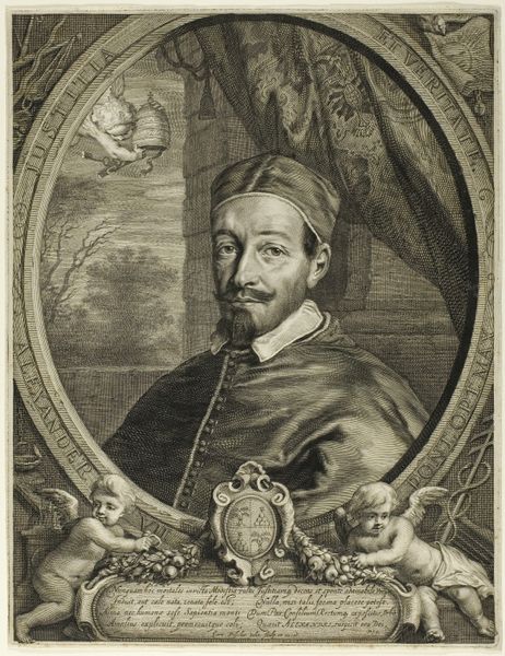 Curator: Immediately, there's a sense of gravitas—that severe profile and intense gaze are quite commanding. Editor: Indeed. This is Jean Morin’s portrait of Cornelius Jansen, the controversial Bishop of Ypres. Morin, active in the first half of the 17th century, captured the theologian in meticulously engraved lines. Curator: The octagonal frame is fascinating. The inscription surrounding Jansen features the phrase "In Veritate et Charitate", truth and charity, framing him as a figure of piety. Editor: But truth and charity were certainly contested terms in Jansen's era. The weight of his theological disputes is subtly present. The somberness speaks volumes about the conflicts of his time. Curator: It’s a powerful reminder of how visual representation and religious politics could become deeply entwined. Editor: Absolutely. And how lasting those visual symbols remain in cultural memory.