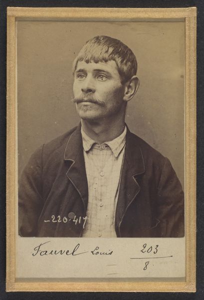 This is an albumen print made by Alphonse Bertillon in 1894, a type of photograph popular in the 19th century. The albumen process involves coating paper with egg white, then a silver nitrate solution, creating a light-sensitive surface. Bertillon was a French police officer and biometrics researcher, and this image is part of his mugshot archive. The seemingly simple albumen print has a very real social significance: it’s about the rise of scientific methods for social control. Consider that shoemaking, Margerand's profession, was then a trade resisting industrialization; his anarchism, a resistance to centralized power. Bertillon's photographic method was intended to classify and control individuals like him, an effort to formalize control of labor through a new level of state power. So, next time you encounter a photograph, remember that even the most straightforward image can have complex ties to labor, politics, and consumption.