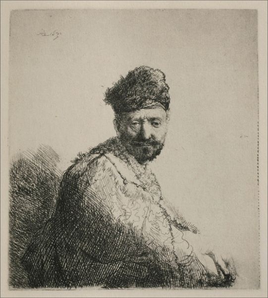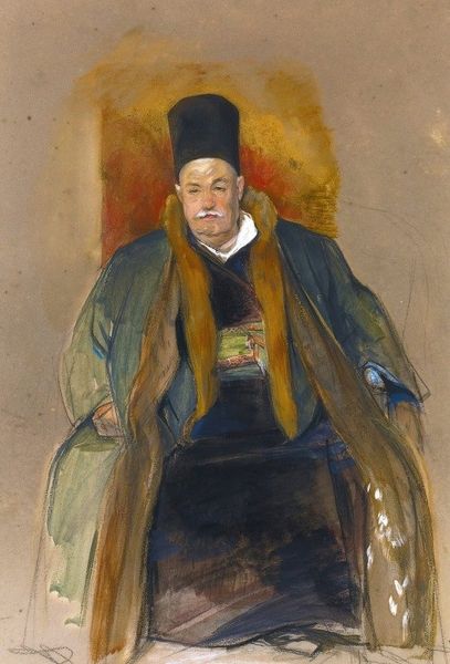 Editor: So here we have Sir David Wilkie's "Portrait of Abram Jacob Messir" from 1841, made with watercolor and drawing. It's quite striking! The gentleman is so formally dressed, almost theatrical in a way. What really jumps out at you when you look at this work? Curator: Well, it’s funny you say theatrical. To me, this whispers of a quiet contemplation rather than a grand performance. I see a man holding not just a book, but perhaps his thoughts, carefully bound. The muted colours are intriguing. Have you noticed how the overall impression is more subdued, with only hints of brighter hues peeking through? Like secrets carefully guarded. Editor: I hadn't really thought of it that way! I was focused on the costume – that large white hat! Does it have some cultural significance, or is it merely decorative? Curator: I imagine the headdress, combined with the other garments, points towards a very particular cultural identity, something the sitter certainly would have wanted to communicate. More than decoration, these clothes spoke to his place in the world. Doesn't it make you wonder about his story, what led him to be immortalized in watercolor? And the very *act* of choosing to be painted—or drawn, rather—what did that mean back then? Editor: That’s a great point, it makes you think! This portrait seems to go beyond just appearances; it's like a doorway into a life, or at least a fascinating sliver of it. Curator: Exactly! And isn't that the magic of portraiture? It captures a moment, yes, but it also sparks endless stories. It gives the quiet moments their own voice, a bit like we are doing here.