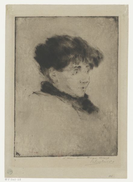 Editor: This etching, "Portret van een jonge vrouw, en profil," possibly from 1887, by Philip Zilcken, presents a profile view of a young woman. There's something quite delicate and subtle about the shading, and it evokes a sense of quiet contemplation. What strikes you about this work? Curator: The very fact that it is a woman depicted by a man at this time brings up interesting questions. While on the surface, it's a study of a young woman in profile, the work can be interpreted through the lens of the male gaze and how women were perceived and represented within patriarchal societal structures. The technique, the etching, further informs our understanding, because it often allowed for broader distribution of the image. Did this democratize art, or did it perpetuate stereotypes? Editor: That's a really interesting point, considering how limited women's agency was at that time. The distribution of this image raises issues regarding spectatorship. Were there expectations placed on how women should behave and appear? Curator: Exactly. Who was this image created for, and what social norms did it reinforce or perhaps challenge? Etchings, especially portraits, often catered to a specific clientele or conveyed specific ideals of beauty, class, and status. Was Zilcken trying to critique the existing social norms, or was he simply a participant in the aesthetic traditions of his time? What kind of conversation do you think that Zilcken was trying to spark? Editor: I hadn't thought about it in that context, but it makes me consider how the very act of portraying a woman, even in what seems like a simple profile, carries so much social and political baggage. The artistic expression reveals more than what is visible to the eye. Curator: Absolutely. Examining these images in a historical context prompts us to challenge our preconceived notions and view art as a powerful form of social and cultural commentary. It requires that we ask these hard questions, even when easy answers aren't available.