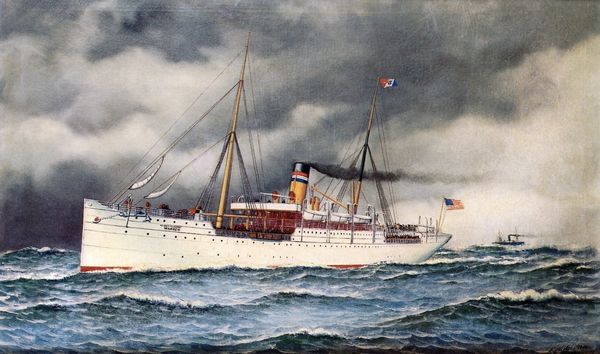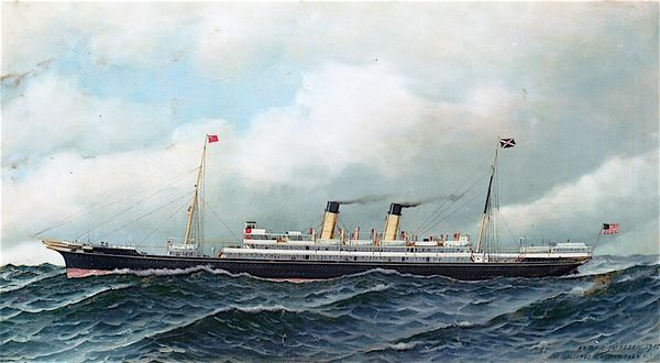 Antonio Jacobsen rendered *The S. S. Touraine of the French Line at Sea* with oil paint on canvas. Jacobsen’s specialization was maritime portraiture; here, the ship is painted with incredible detail, its dark hull cutting through the water, smoke billowing from its stacks. The materiality of this image is intriguing. Oil paint has traditionally been used for ‘fine art,’ yet here it’s deployed for the purpose of technical illustration. Jacobsen seems to have been contracted by shipping companies, who sold these paintings as souvenirs. The precise detailing would have been highly appealing, celebrating the achievement of modern industrial production. Yet the painting also reminds us of labor, of the many individuals who produced the Touraine, and of the sailors and workers who kept it running. Perhaps by recognizing the close observation and steady hand Jacobsen brought to this image, we can acknowledge their contribution too. The next time you see a ship, remember: it is a floating world of work.