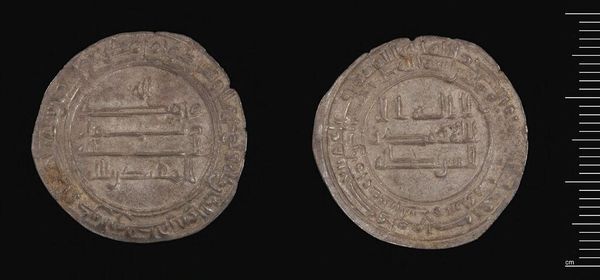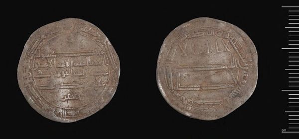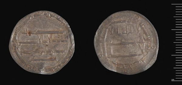 Curator: This is a Dirham coin of Harun al-Rashid, minted in Madina-t al-Salam, or Baghdad, weighing 2.92 grams. Editor: Immediately, I'm struck by its austerity. The silver is worn, but the Arabic calligraphy seems so powerful, almost like a seal of authority. Curator: The production of these coins speaks volumes about the economic infrastructure of the Abbasid Caliphate. Consider the mining, refining, and striking processes involved! Editor: And that calligraphy! It's more than just text; it's a visual representation of power and faith, echoing across centuries. The inscriptions, those carefully chosen words, resonate even today. Curator: Precisely. The dirham facilitated trade, taxation, and state expenditure. The material itself became a tool of governance. The hole punched through it perhaps suggests that it was once someone's keepsake. Editor: Or maybe it was worn as an amulet. These objects carry complex layers of meaning far beyond their monetary value. It's a potent symbol of an era. Curator: Indeed, a fascinating example of how material culture intersects with political and social histories. Editor: It really does give us a sense of the weight of history, quite literally in your terms.