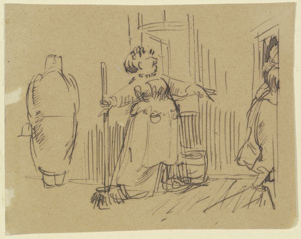 Charles Samuel Keene made "A Vicar and a Curate" using pen and brown ink with gray wash on paper. Keene was known for his satirical illustrations of Victorian society and the middle class, often featured in the magazine "Punch." This drawing presents a snapshot into the rigid hierarchies of the Church of England, reflecting broader social structures. Note the body language of the figures; the vicar's gesture might indicate a moment of contemplation or perhaps a humorous aside, while the curate stands formally, embodying the reserved demeanor expected of his position. Consider also the unseen parishioners—where are they in this moment of clerical interaction? Keene's work offers a window into the negotiation of power and identity within the Victorian era. The drawing's understated humor serves as a reminder of the subtle but ever-present social dynamics that shape our interactions and perceptions.