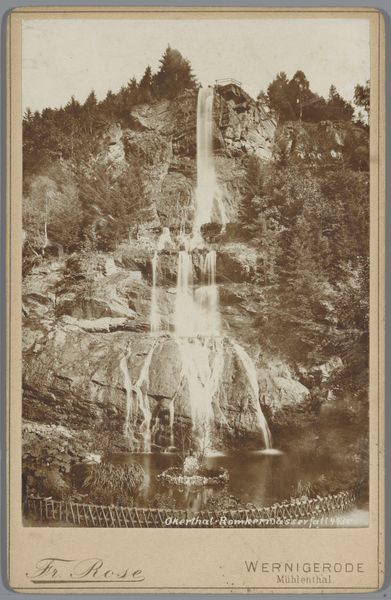 Editor: Here we have *Radauwaterval in de Harz*, a gelatin-silver print from 1892 by E. Mertens & Cie. The way the water is captured, all blurry and soft…it almost feels like I'm looking at a painting, not a photograph. What do you see in this work? Curator: It's crucial to consider the rise of pictorialism during that period. Artists used photography, a new medium, to challenge established hierarchies. What does it mean to choose a landscape like this, and then manipulate the image to soften its realism? Were they critiquing the industrial revolution’s impact on nature? Or idealizing a past that maybe never was? Editor: That's interesting! I hadn’t considered the industrial aspect. Maybe the soft focus aestheticizes nature to counteract its exploitation. Is there also something to be said about water itself as a subject? Curator: Absolutely! Water, especially waterfalls, were laden with symbolism at the time. They represent the power of nature, but also its ephemerality. Think about the growing environmental movements of the late 19th century. This image engages in questions about humanity's place within a rapidly changing world. Editor: So it’s not just a pretty landscape; it's making a statement. Is it fair to say this photo could act as an act of early environmental advocacy? Curator: The connection isn’t always direct, but certainly this photograph fosters a relationship to nature that complicates our understanding of the period. And photographs like this entered drawing rooms, exposing the middle class to these ideas as well. Editor: It definitely gives me a lot to think about in terms of representation and intention! Thanks for your perspective. Curator: And thank you for opening up that line of questioning for us all. Looking through that lens certainly changes how one appreciates it!