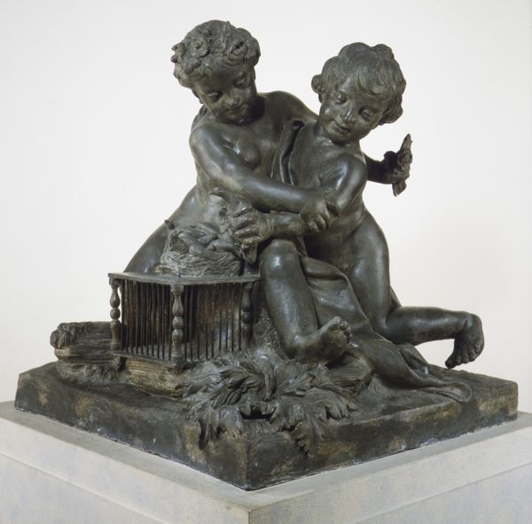 Editor: Here we have Francesco Ladatte's "Children Playing with Fruit," a bronze sculpture made sometime between 1740 and 1755. It's such a tactile piece. All those grapes! What is your take on this work? Curator: It’s intriguing to consider the materials and processes at play here. Bronze, a deliberate choice. We see the Rococo style’s interest in decorative art. But think about the foundry. How was the bronze sourced, who were the artisans, what was their socioeconomic status, and how did this all shape the final product? Editor: So you're focusing less on the allegory and more on the labor of it? Curator: Precisely. Allegories of childhood and abundance were fashionable, but bronze casting in this period represented a sophisticated level of material engagement and craft production. Every stage in the creation reflects consumption. These “Children playing with fruit” become symbolic of class. Where were these sculptures being displayed, and by whom? Editor: So, this isn’t just about the cute cherubs; it’s a snapshot of 18th-century industry. Curator: It’s a trace. Every mark on the bronze, every curve reflects choices about materials, skill, patronage, and consumption. Does this consideration of material labor change how you interpret it now? Editor: Definitely. I was initially thinking of the sweetness of youth. Now I can't stop picturing the people who mined the ore and poured the metal. Curator: Exactly. The artist's decision and the buyer's capital converge in the artwork and transcend mere decoration. We remember the hands that brought it into existence.