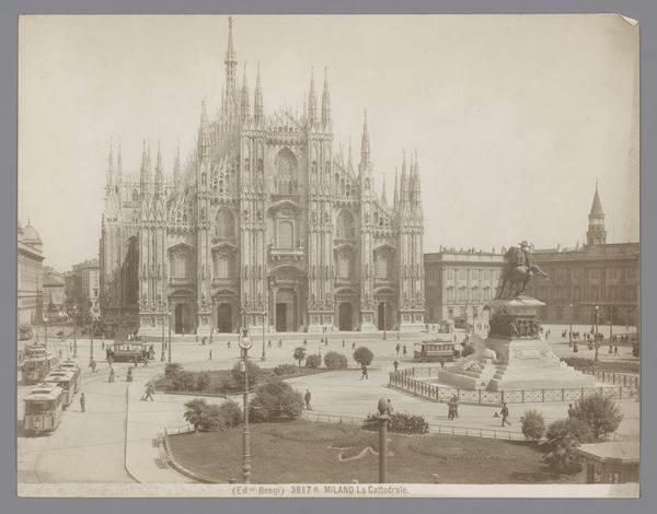 Editor: This photograph by Giacomo Brogi, titled "Kathedraal van Milaan" and taken sometime between 1890 and 1920, is just incredible. The scale is massive, almost overwhelming, but rendered in such fine detail. What strikes me is how it presents power and maybe a certain permanence. How do you interpret this work? Curator: The photograph offers an entry point into discussions about power structures embodied in religious architecture during the rise of Italian nationalism. How does this cathedral function as a visual representation of dominance, especially given the political landscape of the late 19th and early 20th centuries? Think about who had access to commissioning and controlling such grand structures, and who was excluded. Editor: I hadn't considered the power dynamics so explicitly, but now that you mention it, the sheer size does feel like a statement. Was there an intentional message in using photography – a relatively new medium at the time – to capture and disseminate this image of authority? Curator: Precisely! Photography democratized the image, yes, but also served the interests of those who wanted to project a certain image of themselves and their nation. This photograph freezes the cathedral, turning it into a symbol ripe for ideological consumption. What stories might be hidden behind those impressive spires, stories of labor, faith, and exclusion? Editor: So it's not just about appreciating the aesthetics, but also unpacking the layers of meaning related to societal control and national identity. Curator: Exactly. By critically examining images like this, we start questioning the narratives they perpetuate and begin uncovering hidden voices and histories. It's a beautiful piece, but it speaks volumes about visibility, agency, and representation within larger cultural frameworks. Editor: This reframing gives me a whole new perspective. Thanks, it's really fascinating to consider beyond the aesthetic. Curator: Indeed. Art becomes powerful when we recognize its ability to shape perceptions.