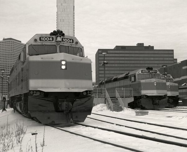 Curator: Let's turn our attention to James Welling's photograph, "Conrail SD50, Suffern, New York," taken in 1990. Editor: It's incredibly stark. The grayscale and elevated perspective really emphasize the train's imposing scale and the industrial landscape. There's a definite sense of controlled power and decay present. Curator: The choice to shoot in black and white, and the setting itself, are fascinating. Conrail, as a freight rail system, held a significant place in the northeast's economic infrastructure, a lifeline almost, reflecting broader post-industrial shifts at the time. Editor: Absolutely. And look at the texture of the train itself: the worn paint, the rivets. You get a sense of the materials pushed to their limit, the tangible impact of constant labor and transport. It is revealing how photographic work of a train embodies high modernist concerns of production. Curator: Welling, though, wasn’t strictly a documentarian. The elevated perspective transforms a workaday scene into something monumental. Think about how museums have preserved steam and diesel engines. We have a historical imperative to archive the transition from manufacturing to information society in postindustrial rust belts. Editor: That's right, it raises questions about how we value these massive objects that were once vital to American commerce. And the way Welling captures the light creates a certain flatness, a detachment almost, that encourages you to analyze its presence not only materially, but culturally. Curator: It seems, too, Welling may be commenting on the sublime, the almost overwhelming presence of the industrial, which contrasts dramatically with the domestic space beside the tracks, further exploring a political commentary in a small city outside of New York City. Editor: Yes, it does feel unresolved and raw. This piece certainly prompts contemplation on the intersection of materials, processes, and our ever-changing relationship with labor and consumption, with echoes of a vanishing American manufacturing history. Curator: A really valuable point! It goes beyond simply seeing a train; it’s a record of a particular socio-economic moment rendered through its architecture and landscape, with broader historical implications. Editor: And perhaps even the train engineer is pondering the future of his profession, which opens questions about technology and work relations in the service sector today. Curator: I concur; thank you for those final sentiments!