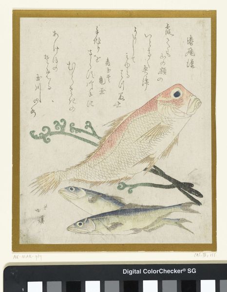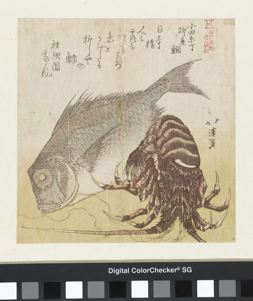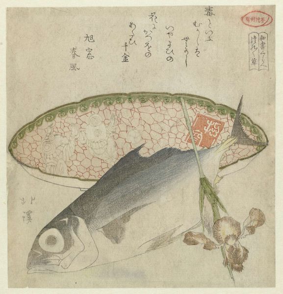 Curator: Here we have a fascinating woodblock print from Japan, made sometime between 1815 and 1820. It’s called “Head of a Salmon” and is attributed to Totoya Hokkei. The piece is currently housed in the Rijksmuseum. Editor: My first thought is how confrontational the image is. It’s stark, isolated. The wide-open mouth filled with those tiny, menacing teeth is a little unsettling. Curator: Indeed. It departs from more traditional landscape and portrait Ukiyo-e prints of that period. Hokkei often collaborated with the more well-known Hokusai, and one can consider that Hokkei often utilized common cultural symbols and presented them from a new lens. Consider, for example, how this fish could represent surplus while also a sense of disconnect and even fear. Editor: I appreciate how you highlight its departure from typical Ukiyo-e traditions. In a culture often fixated on beauty and grace, presenting something so… visceral feels like a statement. This imagery evokes a cultural shift with a complex interplay of mortality, sustenance, and the place of animals in the societal ecosystem. I wonder what that could mean in its context of exhibition. Curator: I'd agree. The prints would have been circulating widely within contemporary Edo society. Consider the work in relation to the rampant commercialization of artistic endeavors during the era. The rise of the merchant class demanded that new and evermore intriguing artwork be produced, and even popularized subjects like an unflinching image of a salmon could have had tremendous appeal, with particular nuances based on its place of exhibition or distribution. Editor: You are right, and that is why I think understanding that cultural dynamic and tension gives this piece, which could simply be about a fish head, significant social meaning and critical weight beyond its obvious visual shock. Curator: It underscores how even seemingly simple imagery can offer a window into societal complexities, consumerist urges, and maybe a subtle challenge to aesthetic norms, too. Editor: Absolutely, viewing art as a reflection and shaper of cultural forces allows us to find its hidden arguments and broader stories.