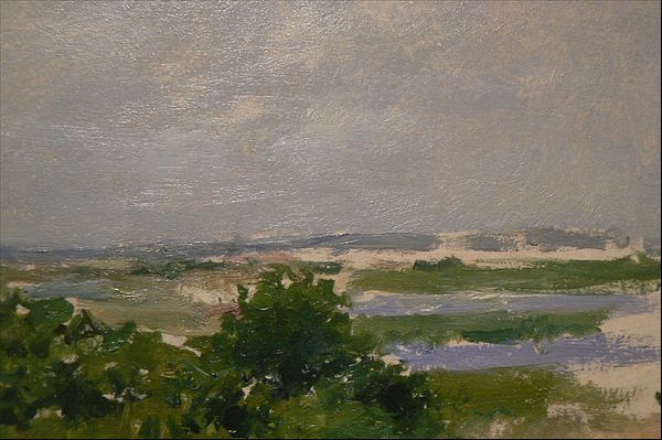 Curator: Gazing upon “Sedniv,” completed in 1977 by Hryhorii Havrylenko, currently residing in the National Art Museum of Ukraine, I’m immediately struck by the muted tones and almost ethereal quality of light. Editor: It feels… damp. The colours are beautiful, soft, yet the scene evokes a distinct sense of coolness, almost melancholy, in its hazy expanse. The texture seems incredibly rich, though restrained by the pervasive grey. Curator: Indeed, it's an excellent example of plein-air painting, a style deeply rooted in capturing the direct experience of a scene. One can almost feel the moisture in the air, and sense the labor involved with painting en plein air. Editor: Look at the application of colour—how the varied greens and browns create a rich tapestry in the midground, offset against the flatness of the sky, how does the use of complementary colours affect the scene, and how are our eyes are being led by it to the church in the background? The artist uses an Impressionistic style. Curator: Precisely. Havrylenko’s work underscores the shifting landscape of Ukrainian artistic identity, existing at a curious nexus point between socialist realism, expected at the time, and impressionist techniques which afforded more aesthetic freedom. Consider, for instance, the accessibility of paint and canvases during that time, and how the artist navigated those material conditions. Editor: You make me see the artist’s struggle—a delicate balance is at play here. It’s neither fully celebratory nor overtly critical. Curator: This duality captures the tension of the era, demonstrating how an artist’s individual interpretation filters into a wider, sometimes fraught social context. One has to admire the artist's intention by providing what he could given material circumstances at the time, in line with a socialist aesthetic of providing accessible and understandable art to the common person. Editor: Reflecting upon the artist's choices within that context casts this seemingly gentle landscape in a more thought-provoking light. Curator: It also helps me think about this work as more than the sum of its artistic parts—that it can function almost as a time capsule, providing a way to appreciate it for decades to come. Editor: It's been insightful to delve into the socio-political underpinnings while appreciating the aesthetic merits.