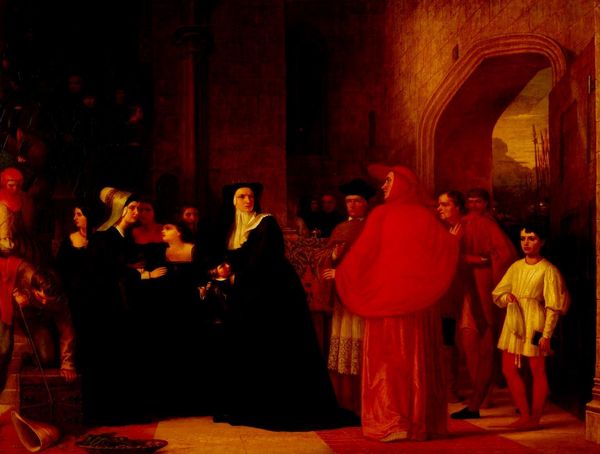 Curator: John Rogers Herbert painted "Sir Thomas More and his Daughter," currently held in the Tate Collection. Editor: It feels heavy, doesn't it? All that deep red and those long shadows. The bars on the window just amplify the sense of confinement. Curator: Herbert was part of the Catholic artistic revival in Victorian England. He portrays More, a Catholic martyr, imprisoned in the Tower of London before his execution. Editor: They're both staring out, but at what? It's like they're looking towards hope, or maybe just the life they're being shut off from. Her face is so stoic. Curator: Indeed. Herbert highlights More's resistance to the King’s supremacy over the Church of England, an act of conscience leading to his death. It speaks to larger themes of power and faith. Editor: It makes you wonder, doesn't it, what you'd stand your ground for, even when staring through those bars. Profound stuff.