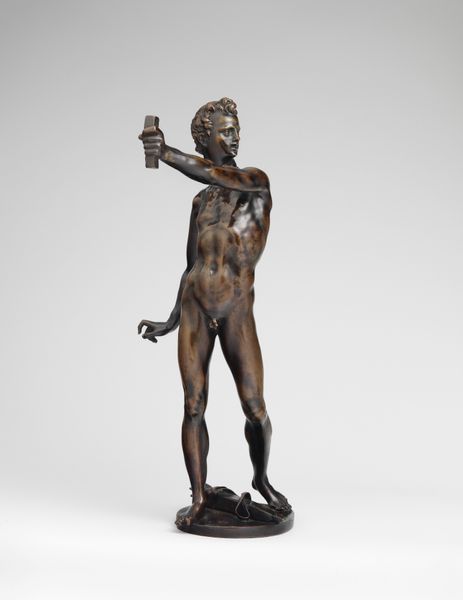 Curator: I'm immediately drawn to the dynamism of this bronze figure. There’s an incredible tension and imbalance conveyed through the posture and extended arm. Editor: Indeed! This is "Pluto," crafted in bronze sometime between 1630 and 1665. It’s currently held here at The Metropolitan Museum of Art and is attributed to Giovanni Battista di Jacopo. Note how the polished bronze enhances the drama, highlighting the subject's muscular form. Curator: The raised fist definitely projects a feeling of defiant power. Yet the slightly tilted head and shadowed eyes create a sense of internal struggle, wouldn’t you say? Perhaps he is questioning his own actions. Pluto is often viewed as a god who rules from a space of power. This rendition doesn't reflect all that. Editor: From a formal perspective, the sculptor's emphasis on contrapposto is masterful. The weight shift creates that energy we talked about while drawing the eye up the spiraling body toward the raised arm and, as you observed, that dramatically shadowed face. It pulls the eye up. Curator: Exactly! It’s also fascinating how Pluto, ruler of the underworld, has evolved in the popular imagination. From a fearsome god to, more recently, almost a sympathetic figure, reflecting our changing attitudes towards death and the unseen. What could the raised hand also signify? Is this how he is viewed? Editor: The textures in the work are intriguing too. The smoothness of the skin is starkly contrasted by the more rugged rendering of the hair and beard, which are just wonderful. A conscious aesthetic choice which emphasizes contrasting emotional states. Curator: The beard, especially, functions almost like a mask, partially concealing his inner thoughts and projecting a veneer of power despite any vulnerability suggested by his stance. Editor: It truly exemplifies the baroque aesthetic. Rich with contrasts in light and shadow, full of emotion...a real feast for the senses and a puzzle for the mind. The sculpture gives a modern-day understanding of power. Curator: Precisely, and those formal contrasts you pointed out work in concert with that sense of emotional complexity, ensuring the image remains relevant. Editor: Well, I'm left admiring Jacopo's compositional virtuosity and skillful use of the material to evoke such raw emotional force. It is just bronze. Curator: And for me, thinking about the power of symbols to evolve and take on new meanings is ever more apparent, and that’s why studying and sharing the arts endures as an important thing to do.