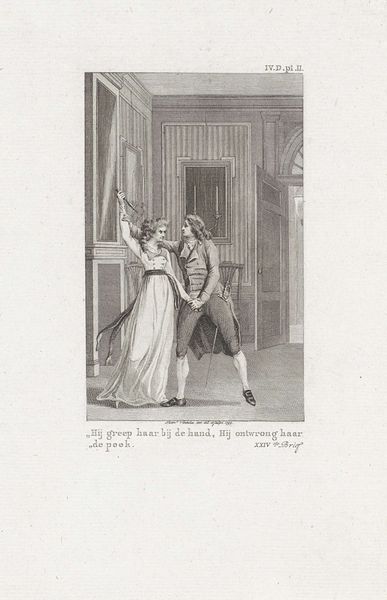 Editor: We're looking at "Vrouw stuurt een man weg uit haar kamer" – "Woman Sending a Man Away from Her Room" – an engraving made around 1803 by Reinier Vinkeles, here at the Rijksmuseum. It has quite the dramatic scene unfolding. I’m really struck by the contrast between the calm interior and the intensity of the woman's gesture. What do you see when you look at this piece? Curator: Immediately, I’m drawn to the formal arrangement of figures within the pictorial space. The stark contrast between the woman's illuminated figure and the shadowed group around the man creates a powerful focal point. Note the carefully calibrated balance achieved through the distribution of light and dark areas; it's a masterclass in Baroque compositional strategies, even this late. What do you make of the line work itself? Editor: It looks very precise. Are there any elements that indicate a narrative, or is it purely formal? Curator: The lines, achieved through engraving, contribute to the overall tension. See how they thicken around the figures’ contours to emphasize their separation, particularly the woman and the intruding man. The fine, delicate lines define the domestic space. Notice how Vinkeles creates depth, from the lines, carefully orchestrating gradations of tone? What emotions does the artist want us to discern? Editor: The perspective is used to put us right in that room, it creates a kind of voyeuristic feel. So you see the composition as reflecting the internal emotional dynamics of the figures? Curator: Precisely. The carefully rendered detail doesn't merely describe the scene; it reinforces a dichotomy between the active and passive. A rupture that invites consideration about Baroque representations and internal tensions. I am eager to inspect its line quality even closer! Editor: That is helpful, it really helps me to consider how period and structure are intrinsically connected. Thank you. Curator: My pleasure. A keen eye will dissect an artist’s skill in crafting compelling relationships.