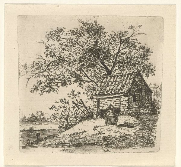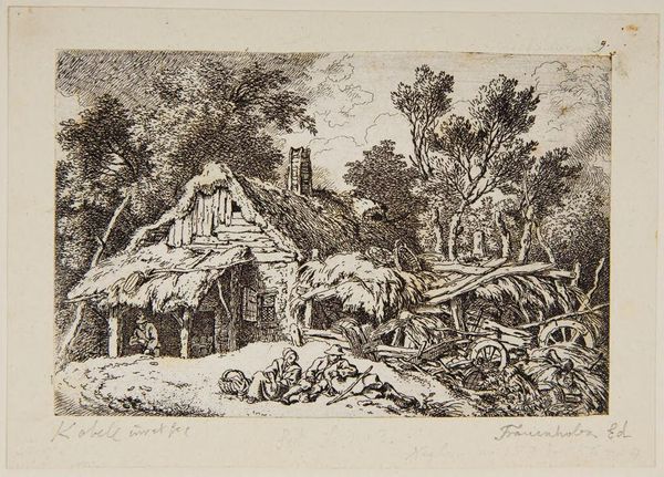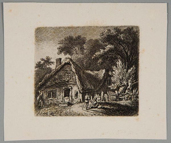 Editor: This is Ferdinand Kobell's "Farmyard with Hens." It has a comforting, almost nostalgic feel. I'm curious, with your knowledge of symbolism, what stands out to you in this piece? Curator: The thatched roof, the cluster of hens, the solitary figure by the fence – these are powerful symbols of agrarian life and its cyclical nature. The home suggests shelter and tradition. What feelings do these symbols evoke for you? Editor: A sense of simplicity and connection to nature. Does the placement of the hens have a specific meaning? Curator: The hens, a common symbol of domesticity and perhaps even fertility, are placed in the foreground, drawing our eye and connecting us to the immediate concerns of survival and sustenance. It roots us. What do you take away from that? Editor: I see how Kobell uses familiar images to create a sense of cultural memory around rural life. Curator: Exactly. The image resonates because it taps into a shared, almost archetypal, understanding of home and nature.