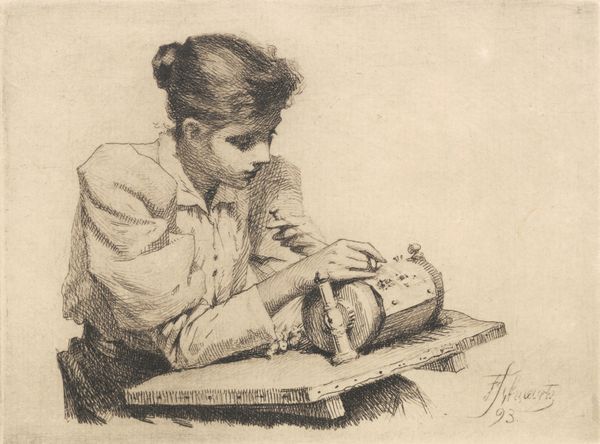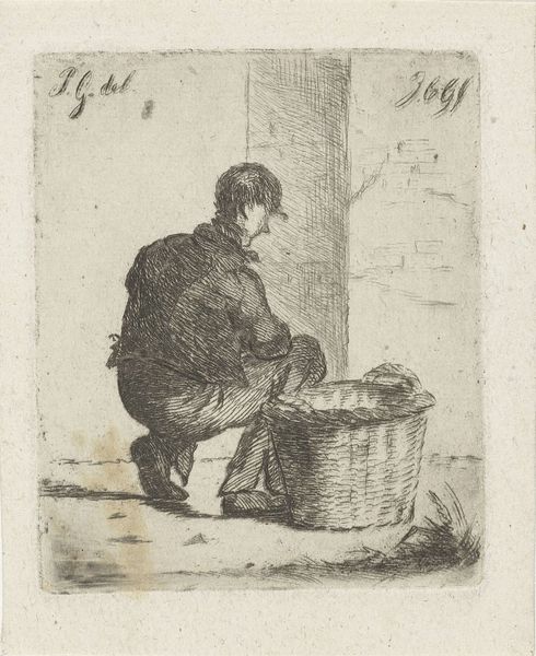 Editor: We are looking at "Boy Eating Soup" by François Bonvin, an etching from 1861. It's a small work, yet incredibly intimate. The boy is completely absorbed in his simple meal. What visual elements strike you most in this piece? Curator: The density of line in relation to the implied light. Bonvin has created remarkable volume, particularly in the figure's coat and legs, simply through the concentration and direction of etched lines. Notice how the background is almost nonexistent, which forces our gaze entirely upon the figure. Editor: It does. It almost feels as though the figure is emerging out of the white. So you’re saying the arrangement of these etched lines are of primary importance here? Curator: Precisely. Observe how the composition relies almost entirely on the contrasting textures and tones achieved solely through the etching process. The formal arrangement creates the emotional impact. Where do you think this emphasis leads us? Editor: It encourages us to look beyond the simple subject and see the artist's mastery of technique, wouldn't you say? It isolates the act of creation and how line becomes form. Curator: Indeed. The stark simplicity forces us to contemplate the method itself, the act of transferring an image through such a demanding medium. It underscores the artistic process as central to our understanding of the work. Editor: I had not considered the degree to which the medium informs the message. Curator: A close examination of form reveals the essence of the work itself. It is about seeing, more than simply what is seen. Editor: Thank you for the enlightening conversation. It highlights how focusing on the form reveals hidden layers of meaning.
