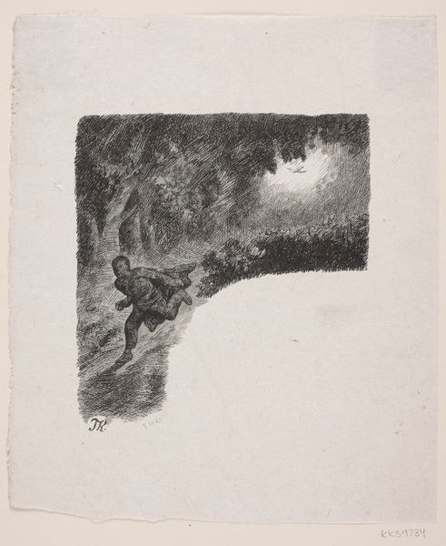 Curator: This etching is titled "Lesse," made sometime between 1867 and 1890 by Philip Zilcken. Editor: It's quite somber. The stark contrasts and sparse detail lend the whole composition a melancholic, almost desolate feel. Look at that looming rock formation. Curator: It's certainly an interesting work in Zilcken's oeuvre. He captures a slice of the Belgian landscape with what seems like a deliberate focus on Realism. What do you make of his choices in portraying the locale? Editor: His manipulation of light is intriguing, don't you think? Notice how the sky, rendered through these intricate lines, creates a stark backdrop that emphasizes the foreground's weighty form. It feels immediate and almost confrontational in its simplicity. Curator: Indeed. The etching technique itself, with its intricate network of lines, conveys texture and form effectively. Zilcken presents Lesse during an era where rural life and the natural world were being impacted by industrialization, even if those effects are muted here. It certainly engages with contemporaneous landscape depictions from the late 19th Century. Editor: Yes, there's something quietly powerful in its formal presentation. I am drawn to the verticality—it gives the image a compelling, structured character. Also note how these linear details offer a sense of scale. What appears to be a narrow trail to the left guides the eye. Curator: It prompts questions about man's place within this landscape, though he never romanticizes or sentimentalizes it. What stands out, though, is that he uses such formal techniques, a lack of embellishment almost, to engage the political and social climate of the time. Editor: Right, stripped of any grandeur, this landscape reflects a more subdued truth. In the end, it's not just a scene, it's an experience delivered in line and form. Curator: Exactly. Zilcken’s ‘Lesse’ pushes the tradition while offering viewers insight into how the late 19th Century perceived its transforming surroundings.