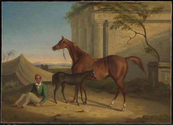 Johann Georg Pforr created this oil on canvas, "Two English Horses", now displayed at the Städel Museum. The composition is dominated by two horses at the forefront, set against a hazy landscape rendered in muted greens and yellows. This evokes a sense of distance and romanticized nature. The painting plays with formal conventions through its treatment of perspective and depth. The horses and rider are vividly detailed, while the background dissolves into less defined forms. This contrast emphasizes the foreground, but also creates a visual hierarchy where nature is secondary to the figures. The painting also reflects broader artistic and philosophical currents related to man and nature. The dog almost seems to be of a piece with the horses, as if they are all performing roles in this landscape. There are cultural codes embedded here that speak to the social values placed on animals in that era. The painting invites ongoing examination of how these elements reflect evolving perceptions of nature.