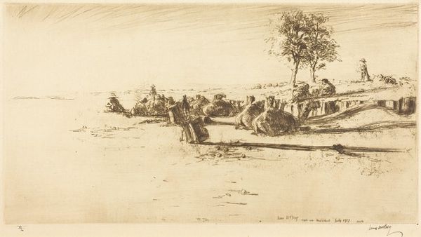 Editor: So, here we have James McBey's etching, "The Amstel," created around 1910. It’s a very delicate print. The etching lines are so fine. I get a sense of peacefulness, of a quiet moment on the water, but the windmill looming in the background feels significant. What do you see in this piece? Curator: The windmill, yes. Notice how it commands the skyline. The Dutch windmill has long been a powerful symbol, beyond its functional purpose. Consider its iconic presence as a symbol of progress, national identity, and, quite literally, the harnessing of natural forces. In a broader sense, it’s a symbol of resilience, innovation and land reclamation within Dutch culture. The lone figure in the boat -- does this speak to you? Editor: It does, actually. He seems like a small part of a bigger landscape. Does that mean something? Curator: Precisely! The figure, small against the grand landscape and the powerful symbol of the windmill, suggests humanity’s relationship with nature and progress. What do you make of the artist placing him centrally? He is on the water in between us as a viewer and the looming windmill, a human element within this narrative. Editor: Perhaps it is to balance things? To ground the more fantastical image of a windmill in real human labor? Curator: Interesting point! Etchings, too, as a medium, were undergoing a resurgence around that time. Artists turned to it for its directness, and that gives McBey's etching an intimate feel that still connects with us today. Editor: I hadn't considered the technique itself as symbolic. It adds a whole new layer of interpretation! Curator: Visual symbols gain layers over time, so think about what remains, and what new elements add to a symbol’s narrative over generations. I think what we both can conclude, is that “The Amstel” becomes far more than just a depiction of a peaceful landscape. Editor: Absolutely. Thanks to this conversation, I definitely have a better understanding of the cultural weight an image like this carries.