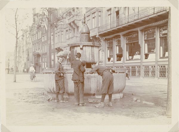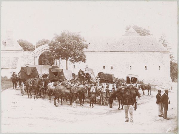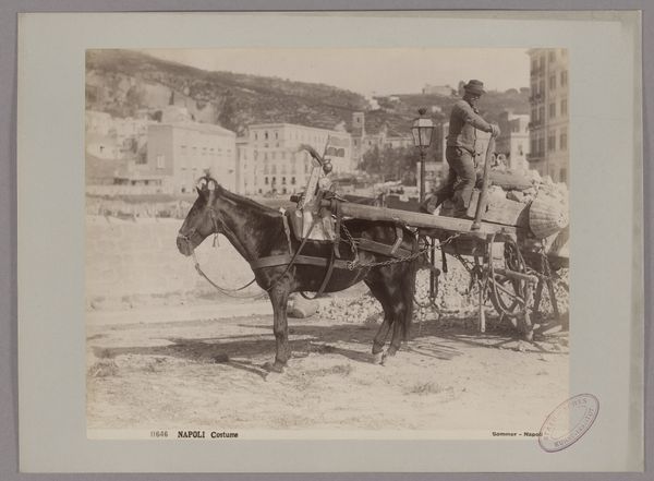 Curator: This albumen print, dating to the 1880s, is titled "Carro con buoi, Perugia" and was created by James Anderson. The scene depicts a cart pulled by oxen in the Italian city. Editor: It has such a stillness to it, doesn't it? A sepia-toned quiet, like a moment lifted from a half-remembered dream. The weight of the cart, loaded down with barrels, and the solid presence of those oxen... you can almost feel the cobblestones underfoot. Curator: It's fascinating how photography at this time began shaping the perception of cities for a broader audience. Think of the influence these images had on tourism and cultural understanding, showing a romanticized, perhaps slightly exoticized, vision of Italy. Editor: Absolutely. And I'm immediately drawn to the craft itself—the labor that went into not just the hauling and the commerce of whatever is inside those barrels, but the actual making of them, the sourcing of the wood. Consider the work in tanning the hides to make the harnesses as well. There is such a celebration of labour happening right in the centre of town. Curator: Indeed. Beyond just documenting a scene, Anderson also presents a carefully constructed view. It emphasizes tradition, a kind of timelessness that was often marketed to travelers eager to experience "authentic" Italy. The photograph flattens some truths to heighten others. Editor: Yet there’s truth in the materiality itself—the wear on those cobblestones, the texture of the oxen’s coats. Even in this image, there’s an inescapable honesty to the physicality of the scene. Also, you can still see some people going by! Life carries on! Curator: Ultimately, photographs like these played a role in shaping historical narratives. They are simultaneously records of the past and interpretations colored by the social and political context in which they were made and received. It shows the city centre and what activities happened around it. Editor: Yes, seeing the photograph through a material lens highlights what went into a single photographic moment, and makes one think of those long-forgotten labors and materials. I find that rather compelling.