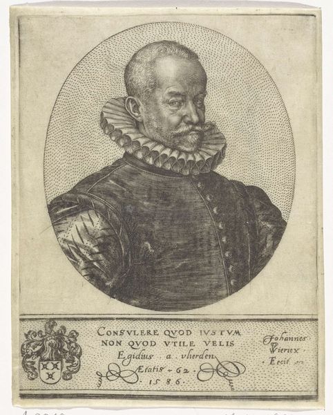Dominicus Custos created this portrait of Marcus Fugger in printmaking, sometime around the turn of the 17th century. The subject’s face is striking, rendered with meticulous detail. The composition is contained within an oval frame, which offers an interesting contrast between the softness of the portrait and the rigid geometry of the border. The print relies on line and texture to create form. Note the use of hatching and cross-hatching which defines volume and shadow across Fugger's face and clothing. These techniques reflect the formal precision valued during the Renaissance, echoing the engravings of artists such as Dürer. But it’s not just about technical skill. The very act of framing and containing the subject can be interpreted through structuralist lenses, suggesting ideas of social identity. The frame functions as a signifier, marking him as a figure of importance and authority, a visual encoding of his status within society. Ultimately, the beauty of this portrait lies in the way it encourages us to decode its visual language.
