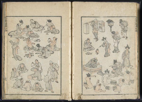 This is a page from ‘The Quick Pictorial Dictionary,’ a multi-volume woodblock-printed book by Katsushika Hokusai, the celebrated Japanese artist, who lived from 1760 to 1849. Hokusai was a popular artist, and he made these books to teach his visual language to others. He wanted to show people how to depict all sorts of subjects from Japanese life. The figures in this page represent different actions, emotions, and social roles. This dictionary shows us something about the place of art in Japanese society at the time. Art wasn't just for the elite. Hokusai’s dictionary democratized the knowledge of artmaking. It was designed to reach a broader audience. To understand it better, you might look at the history of printing and publishing in Japan, the changing social structure of the period, and the growth of cities like Edo (now Tokyo). These are just some of the resources that help us understand the social life of art.