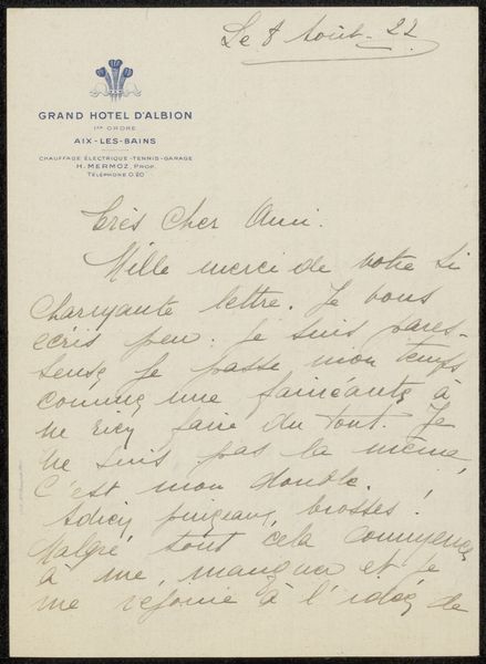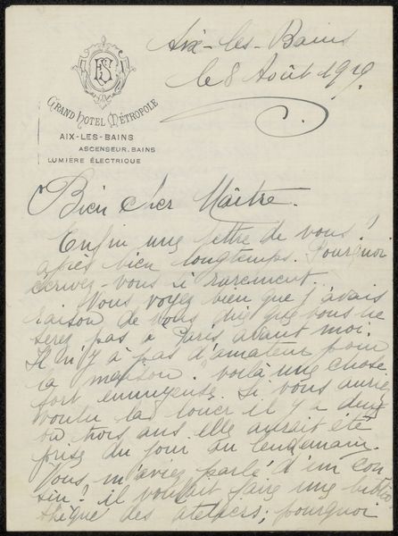This handwritten letter to Philip Zilcken from Rose Imel presents a fascinating interplay between personal expression and formal design. The letter, penned in fluid script, covers most of the page, creating a textured surface where language acts as both communication and visual art. The composition is organized vertically with the letterhead of the Grand Hotel D'Albion in the upper left corner. This framing device, together with the sender’s address, suggests a deliberate staging of information. Imel’s handwriting, with its loops and varying line weights, gives a sense of intimacy, while its density conveys a sense of urgency or passion. The overall impression is one of controlled expression, where the act of writing becomes a performance. The letter could be seen as a semiotic field where words and script function as signs, offering insights into the writer's state of mind and relationship with the recipient. The letter’s aesthetic emerges not just from the content of the words but from their visual arrangement, suggesting an intimate dialogue.