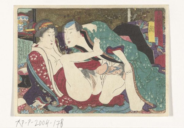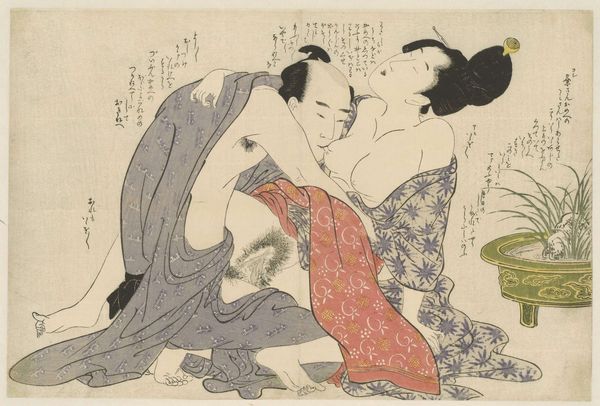 Isoda Koryūsai made this woodblock print, Kissing Her Breast, in Japan during the late 18th century. At the time, Japanese art was undergoing transformations brought about by increasing urbanization and commercialism. Prints such as this one—known as *shunga*, or “spring pictures”—were widely circulated in Japan during the Edo period, reflecting a relatively open attitude toward sexuality compared to other parts of the world. *Shunga* prints were not only produced by artists working outside of established schools, but were also produced by those working in the academic style. The detailed rendering of the lovers' bodies, along with the rich patterns of their clothing and bedding, speaks to the sophistication of Japanese printmaking at this time. To further understand this work, one might consult studies of Edo-period social and artistic life, collections of similar prints, and historical accounts of sexuality and censorship in Japan. By considering this print within its social and historical context, we gain a deeper appreciation of its cultural significance.