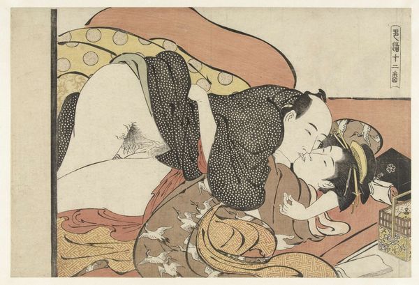 A couple lies surrounded by robes and bedding, a folding screen in the lower left corner provides some privacy. He kisses her breast and pulls at the opening of her kimono while she covers her mouth with her sleeve, perhaps in embarrassed anticipation.