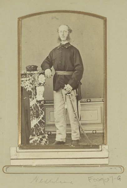 Curator: This striking image is titled “Portret van een (vermoedelijk) Italiaanse zoeaaf, staand” – “Portrait of a (Presumed) Italian Zouave, Standing”. It was taken sometime between 1861 and 1866 by Fratelli d' Alessandri. Editor: My first impression is how… stiff he appears. But there's something very intriguing in the materiality of this image, a play with soft focus that enhances details, like the stitching in his jacket or the tasseled sword. What were Zouaves doing in Italy then? Curator: The Zouaves were originally a unit of the French army, but other countries adopted the uniform and the concept. It’s fascinating, really, this man posing in what is essentially a readymade military identity. The image underscores the way national identities were being crafted and performed. Editor: Crafted is the right word. Look at how precise the photography is; it clearly seeks to emulate painting, even to mimic classical composition. It makes me wonder about the work that went into his uniform and his reasons to buy such photo from Fratelli d' Alessandri. Was he fighting for the Papal States? What motivated the production and the demand of these photographs? Curator: Yes, he most likely fought for the Papal States. It is known that many joined the Papal Zouaves who answered the Pope's call. His studio portrait served as both personal memento and propaganda. What it signals about the cultural significance of this moment of Italian unification cannot be understated. Editor: Agreed, it's a collision of cultural symbols. But getting back to craft, think about the photographer's labor. It must've been such an involving activity setting the subject up, ensuring everything was aligned, the light just so… The materiality really embodies its historical moment. Curator: Ultimately, this is not merely a snapshot of a man, but a visual condensation of the complex interplay of faith, identity, and military conflict within a specific historical juncture. Editor: I will certainly think about photography in terms of the global supply chain from now. There's also a beauty in the detail that goes far beyond capturing mere likeness. Thank you!