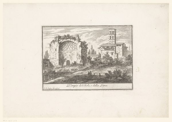 This is an etching of the Ruin of Heenvliet Castle made by Jacobus Schijnvoet in the early 18th century in the Netherlands. The image presents us with the crumbling remains of a once-imposing structure, reflecting a broader cultural fascination with ruins that emerged during this period. This interest was intertwined with the rise of historical consciousness and national identity. Castles were powerful symbols of authority and the Dutch landscape is full of them. Consider how the artist uses light and shadow to enhance the ruin's drama, emphasizing its weathered stones and overgrown vegetation. This romanticized depiction aligns with the aesthetic sensibilities of the time, reflecting a nostalgia for a bygone era. The institutional history of art collecting and preservation is vital here; prints like these served to document and disseminate knowledge about historical sites, contributing to a sense of national heritage. To truly understand this work, one might delve into archives, maps, and architectural records, and explore the social and political contexts that shaped its creation. Doing so reveals the shifting values and cultural meanings attached to the past.
