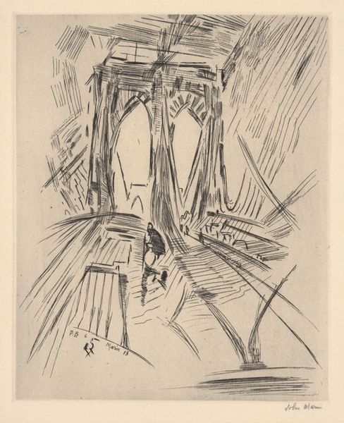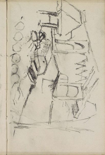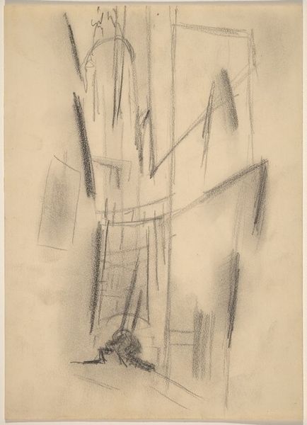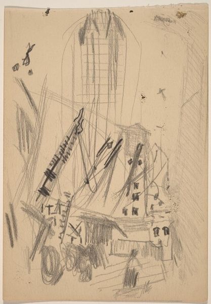 Curator: This piece, an untitled pencil drawing by John Marin, depicts New York City in a rather dynamic way. Editor: My first impression is controlled chaos. It feels almost as if the city itself is vibrating, ready to spring from the page. What sort of paper would Marin have used, and did the choice reflect his urban subject matter? Curator: That's an interesting angle. He more than likely used readily available sketching paper of the time; examining his technique—the forceful, rapid lines and overlapping forms—is more enlightening. Consider this drawing not simply as a picture *of* New York, but also as a product *of* New York's frenetic energy, channeled through the artist. Editor: The art market certainly shaped perceptions of the cityscape genre and what was deemed "high art" and "mere" drawing. And I wonder how exhibitions that included similar sketches, would impact public appreciation for everyday subject matter... Curator: Absolutely. The urban sketch gained prominence in relation to developments like the rise of mass-produced art supplies. Marin himself likely benefitted from new access to materials that democratized the creation of art. Editor: These quick pencil drawings were part of shaping a visual rhetoric of modernism, echoing architectural forms like skyscrapers and capturing an overwhelming urban environment that has a complicated relationship with citizens: on the one hand enabling a social sphere, and, on the other, rendering individuals invisible, alienated within mass society. The style is deliberately jarring. Curator: And that connects, perhaps, with what’s going on socially in New York itself. Think about immigration at the time, the rise of industry, how architecture and materials themselves were transformed by forces of urbanization. All those intersecting lines – economic, social, infrastructural - are right there in this drawing. Editor: A drawing can serve as an invaluable historical artifact of modernity itself and the rise of urban centers. Even something as seemingly mundane as its materials helps reveal art’s relationship to larger forces of industrialization. Curator: Precisely! This drawing really pulls back the curtain on that relationship between art, the built environment, and the technologies shaping everyday life.