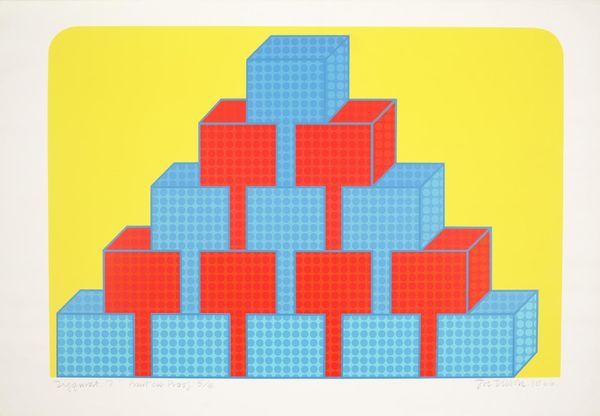 Curator: My first thought is... playful. Like a geometry lesson gone delightfully wrong. Editor: That’s a good start. We're looking at Joe Tilson's "Geometry?" created in 1966, here at the Tate. It’s fascinating how Tilson challenges the formal rigidity often associated with geometric abstraction. Curator: Exactly! There’s this sense of humor, of questioning. The bright yellow and the almost comic-book-like dots undermine any seriousness. It feels very Pop Art. Editor: Absolutely. It's a reflection of the socio-political landscape, questioning established systems, including art itself. The title implies doubt, doesn't it? Curator: It does. Almost like Tilson is inviting us to reconsider what geometry, or even art, can be. And maybe to not take it all too seriously. Editor: Perhaps it's a commentary on how society tries to impose order, even where it doesn't quite fit. Curator: Yes! It’s as if Tilson is winking at us, saying, "Let's break these rules, but with a smile." Editor: It’s interesting how the art invites us to question, and also to smile a little. Curator: Absolutely. It is both, and that is what makes it fascinating.