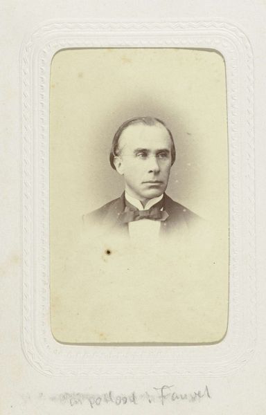 Curator: Here we have an intriguing photographic portrait titled "Portret van een man, aangeduid als P. Smit," likely crafted between 1858 and 1874, attributed to A. Bőeseken. It’s a daguerreotype, a remarkable photographic process of its time. Editor: What strikes me is its air of quiet dignity, the careful composition lending an almost sculpted quality to the man's features. There's an incredible sense of stillness, a sort of suspended moment in time. Curator: The limited tonal range inherent in daguerreotypes accentuates the subject’s composed posture and controlled expression. Observe how light and shadow coalesce to create dimensionality. It invites us to contemplate not merely his image but his constructed self, filtered through the aesthetic and technical parameters of this nascent medium. Editor: Precisely! This isn’t just about replicating a likeness. The slight upward tilt of the head, the neatly arranged tie…it signals societal status and self-possession, hallmarks of the era's bourgeoisie. It's almost an archetypal image, yet there's an inherent vulnerability captured within the sitter's gaze. The details carry meaning far beyond a simple recording. Curator: I concur. Moreover, this mode of representation embodies the period’s developing understanding of visibility, of crafting images that transcend the material and aim for a kind of ideal. Look closely, and you'll see this intent manifest. Editor: Looking at it, I consider what secrets are veiled behind his unwavering composure, and how photography from this moment has deeply shaped our notions of what it means to present oneself to the world, not only on the level of representation but how codes of presentation get passed on. Curator: An insightful point! The formal constraints inadvertently illuminate what lies unstated. We see an indexical marker embedded in both time and place through image design, and technique, while the sitter attempts to overcome those limitations to communicate a truth through the way he presents his portrait. Editor: Indeed. So much resonates from such a quiet, carefully calibrated composition. Curator: The image really illustrates how formal construction becomes a container for narrative depth.