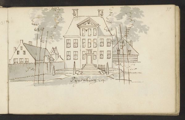 Cornelis Pronk created this drawing of Slot Appeltern with pen and brown ink, using gray wash. The meticulous linework defines the architectural structure, establishing a clear distinction between the solid castle and its surrounding landscape. The artist utilizes a restricted tonal range, and this limitation underscores the geometric arrangement of the composition. Pronk's formal approach invites a structuralist reading; the facade with evenly spaced windows, the orderly arrangement of the trees and the stark linearity of the canal create a semiotic system of signs and codes. The drawing seems to communicate a sense of order and control, perhaps reflecting a cultural desire to categorize and understand the world. Note the tower of the castle, a vertical element that disrupts the horizontal lines of the overall composition. This counterpoint introduces a subtle tension, a disruption that prompts viewers to question whether this image merely represents reality, or if it also challenges our preconceived notions of space, perception, and representation.