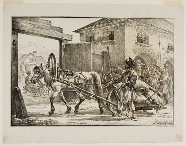 This etching, “Russian Soldiers with a Barber,” was created in 1816 by Johann Adam Klein. The composition is organized around a central wagon, dividing the scene into distinct spatial zones occupied by soldiers. Klein masterfully uses line and texture to convey the rough, itinerant life of soldiers. Notice the detailed hatching that defines the characters’ clothing and facial features, lending them a sense of volume and realism. The scene is rendered with a meticulousness that invites close inspection. Each figure is delineated with precision, underscoring the human aspect of military life. The act of grooming, a moment of civility amidst the potential chaos of war, may challenge typical depictions of military life. Consider how Klein’s structured approach—with its balanced arrangement and linear precision—presents a view of the Russian military through the lens of order. In this tableau, Klein highlights the intersection of personal care and military readiness.