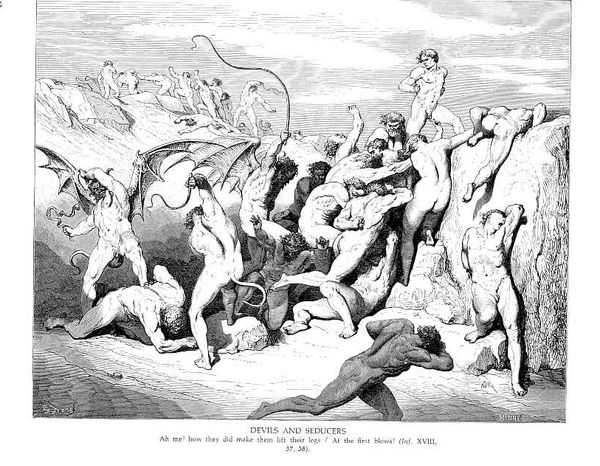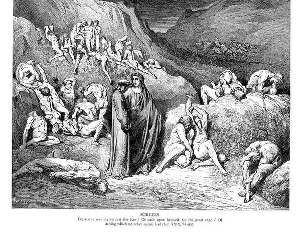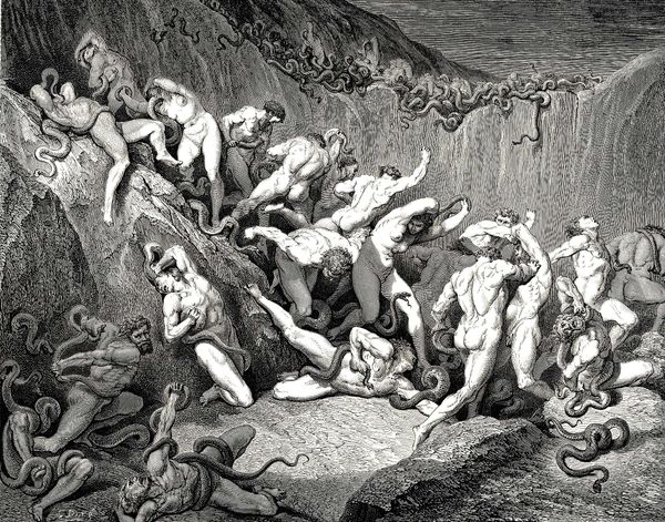 Editor: Here we have "Thieves," an engraving by Gustave Dore. It depicts a chaotic scene of nude figures entwined with snakes. It’s incredibly visceral; what strikes you most when you look at this work? Curator: The visual drama Dore creates is undeniable, but let's delve into the "why." Consider the historical context. The 19th century was a time of significant social upheaval, class disparity, and the rise of industrial capitalism. Could this chaotic scene be a commentary on a society grappling with its own moral failings, where punishment and suffering become almost a spectacle? How does this image resonate with anxieties about sin and redemption present during that period? Editor: That's a fascinating perspective. I was mainly focused on the literal depiction of punishment, but seeing it as a social critique adds another layer. Are the snakes symbolic of something beyond just torment? Curator: Absolutely. Snakes often carry multiple symbolic weights. Think of the biblical serpent, tempting and deceitful, but also potentially representing transformation or healing in other cultural contexts. Here, consider them as the binding constraints of societal norms or the biting consequences of transgression against those norms. The nakedness also invites questions. Why are these figures stripped bare? What does that vulnerability tell us about power dynamics at play, both within the artwork and in the world it reflects? Editor: So, it's not just a depiction of hell, but also a reflection on societal issues. The nudity suggesting the vulnerability and the snakes being a physical embodiment of punishment. Curator: Precisely. Art often holds a mirror to society, reflecting its anxieties and power structures. It’s up to us to engage critically with these reflections and understand the dialogue it begins with viewers throughout history. Editor: I’ll never see Dore in quite the same way again. Thanks for sharing your insights. Curator: And thank you for your keen observation; engaging with art this way opens up many exciting dialogues and learning opportunities.