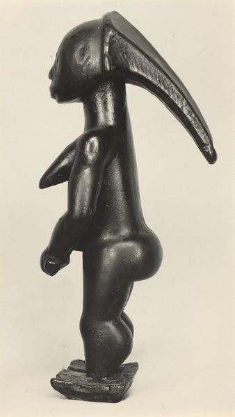 Editor: Here we have Walker Evans’s photograph of a wooden headrest made in 1935 by the WaZimba and MaNyema people. It feels strangely monumental in this composition, a merging of the functional with something… totemic. What’s your take? Curator: I find myself drawn to its stillness. There’s an inherent contradiction here. This is an intimate object, something to cradle a resting head, but presented almost like an austere monument in Evans's shot. Do you see how the figure supports the headrest, not just structurally but almost spiritually? It’s a really moving interplay between support and burden, stillness and function. Editor: It almost seems sad, with the downturned eyes of the figure. Was it meant to depict someone specific? Curator: That's the fascinating part. These headrests weren't necessarily portraits, but more about invoking a presence, a connection to ancestors or spirits, perhaps lending protection or blessings during sleep. That form—the gentle curve where a head might lay – that's not just practical; it's a kind of hopeful gesture towards dreams, wouldn't you say? A silent promise of safe passage into the night. Editor: I hadn’t thought about the protective element – I was so focused on the figure. That adds a whole other layer. Curator: Right? It makes you think about what we value, what we entrust with our vulnerability. An object imbued with meaning becomes a silent guardian. I see in it the echo of whispered prayers and shared dreams. Editor: I’ll definitely see these types of objects differently now. It really puts functionality into another light.