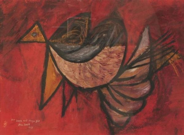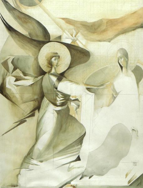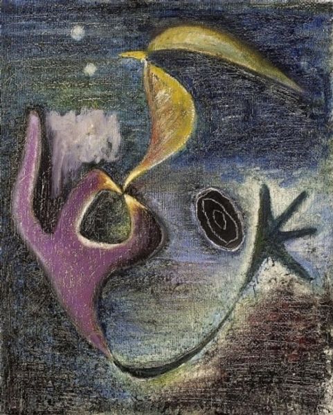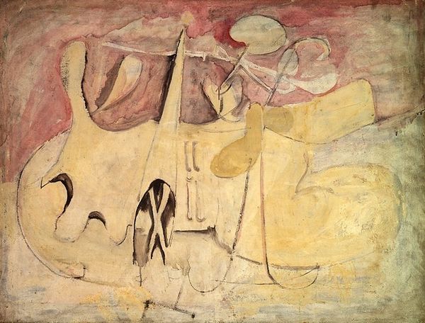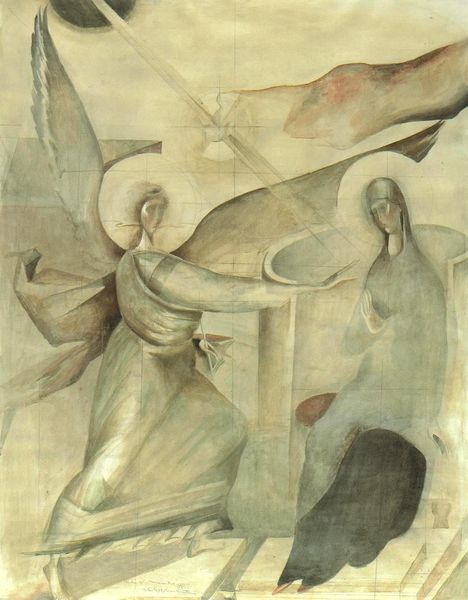 Curator: This is Leonora Carrington's "El Gato," painted in 1951, using oil on canvas. The painting seems to be illustrating a rather somber mood through the surrealist scene it illustrates. I'm curious about your perspective on it. What stands out to you? Editor: It’s definitely strange! I notice this striking contrast between the muted tones and the really bizarre figures she’s depicted, and the actual impasto. How might Carrington’s process and her choice of materials contribute to the overall effect of the work? Curator: That’s a really insightful observation. We can see the blending of fantasy with everyday resources; oil paint wasn't exclusively for "high art," right? The materials she chooses allow for the manifestation of dream imagery. The social context matters: Carrington had limited resources. How does this inform the types of canvases she chose to paint on? Are they reused canvases, or are they carefully chosen based on other external constraints? Editor: So you’re saying her choice of material might speak to some extent about constraints, perhaps reflecting her status or access at the time. Could the subject matter in "El Gato," the feline form, also challenge art traditions regarding the artist’s labor? Curator: Absolutely! Think about what was acceptable. Does she challenge traditions? The cat may be representative of something larger here. Look at it within the lineage of animal representation in art history, and consider her individual labor to create something so fantastic in post-war Mexico. The material application creates layers both literally and conceptually. What labor and context does that suggest to you? Editor: I see your point. It is interesting to think of surrealism not just as fantasy, but connected to tangible constraints. So it brings this conversation to art, making and her labor, not just about her creativity but about production, and that's eye-opening for me. Thanks! Curator: Indeed. Focusing on materials and production allows us a grounded entry into understanding such a seemingly bizarre and otherworldly picture.