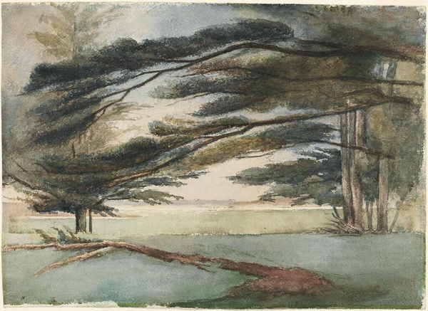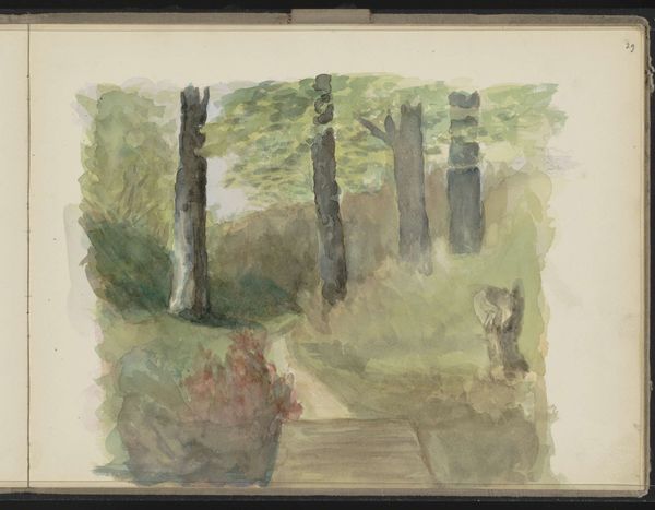 Curator: Here we have Eugène Delacroix's watercolor, "Landscape (George Sand’s Garden at Nohant)." Editor: It’s so immediate, like a quick impression captured with very fluid brushstrokes. The way the pigment pools and bleeds makes me think about the actual working process of applying watercolor. Curator: Notice how Delacroix uses layering and transparency to create depth. The tonal gradations aren't just mimetic; they construct an entire pictorial space. Also, what do you think about the artist's choice not to depict the sky in this image? Editor: It’s a beautiful study in contrasts: the airy foliage versus the solid tree trunk, the controlled washes against the paper's surface. I wonder what sort of paper this is and how its texture influenced the final work. Curator: Precisely. Materiality informs the perception; technique constructs a complex reality. Editor: It is compelling to consider how the landscape tradition can be revitalized through attention to process and the physical properties of the medium. Curator: Indeed, a work that rewards close looking and deep consideration of its artistic and material underpinnings.