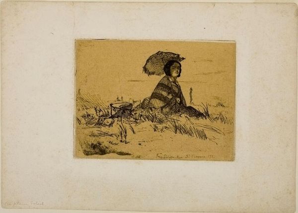 Editor: This is Eugène Boudin's "Sun-Shades, Trouville," created in 1869, using watercolor on paper. There’s a delicate, ephemeral quality to it, almost like a faded photograph. What stands out to you about this work? Curator: Immediately, I see the emphasis on *how* this scene was made. Boudin’s rapid, almost stenographic brushstrokes using watercolors, that privilege of *plein air* work are key here. The very mobility and accessibility of watercolor as a medium is critical for his rapid, light capture of the leisure classes along the Normandy coast, turning labor and observation into leisure itself. Editor: So, the *process* and *materials* tell a story about the changing social landscape? Curator: Absolutely. Watercolors weren't just about mimicking reality; they were about *engaging* with it in new ways. Consider the social stratification; are these figures consumers or are they being consumed by Boudin for the commercialization of leisure? How does the materiality of watercolor contribute to its popularity with both amateur and professional artists alike at this time, making "high" art techniques more accessible for some? Editor: That's fascinating. I hadn't considered the role of the materials themselves in reflecting social dynamics. What about the umbrellas? Were parasols so important? Curator: The umbrellas serve as potent visual markers. The commodification of protection from the elements, a sort of literal "sun-shade", highlights the social performance underway, which emphasizes bourgeois decorum and distancing from manual labor in the sun, using both labor and tools to define class. They transform work, even in its depiction. Editor: This really gives me a different way of seeing this watercolor. I was so focused on the aesthetic quality of the brushstrokes; it makes you realize it represents so much more. Curator: Exactly. It is that dance between intention and observation, but most of all, the production that defines its art historical relevance.